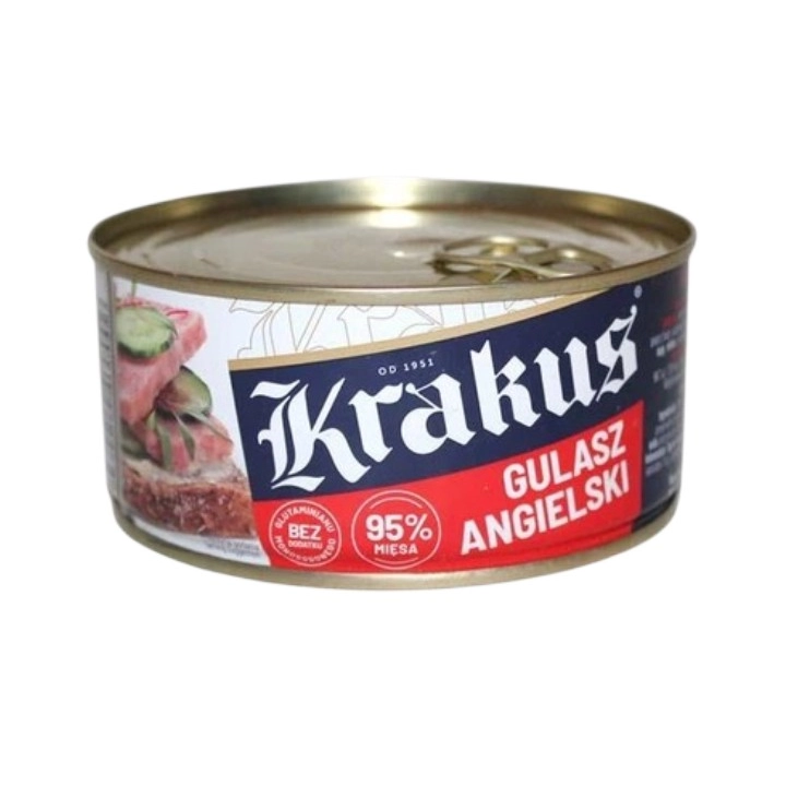 Збалансований смак Гуляш ангельський Krakus 300 г має насичений м’ясний смак із легкою пряною ноткою та ніжною текстурою. Консистенція однорідна, соковита, що дозволяє легко намазувати продукт на хліб або використовувати як основу для швидких страв. У смаку відчувається природна солонуватість і делікатний аромат спецій, які підкреслюють м’ясну основу без різкої гостроти. Натуральність і технологія виробництва Консерва виготовляється переважно зі свинини — близько 95% м’ясної частини, з додаванням солі та натуральних спецій. Продукт проходить стерилізацію та герметично запаковується, що забезпечує тривалий термін зберігання без втрати смакових властивостей. Такий склад формує класичний м’ясний профіль із мінімальною кількістю вуглеводів. Універсальність Гуляш ангельський Krakus добре підходить для швидких перекусів і повноцінних страв. Його можна використовувати як намазку на бутерброди, додавати до макаронів, каш або картоплі, а також брати з собою в дорогу чи на пікнік. Завдяки високому вмісту м’яса продукт має поживний і ситний характер. Зручність споживання Металева банка 300 г зручна для зберігання та транспортування. Продукт готовий до вживання без додаткової термічної обробки, а після відкриття його можна швидко використати для приготування перекусу або гарячої страви. Гуляш ангельський Krakus 300 г — ситний м’ясний продукт із високим вмістом свинини та класичним смаком, який підходить для швидких перекусів або приготування простих домашніх страв, тому рекомендуємо для щоденного використання.